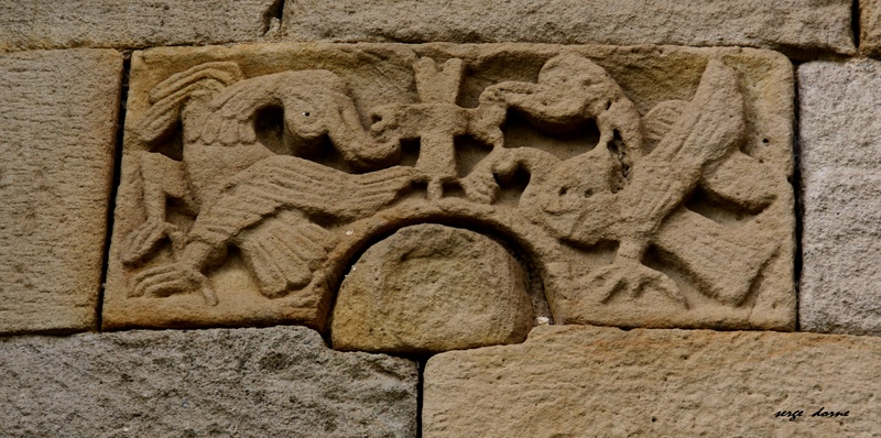 Dans le mur de l'abside au-dessus d'une fenêtre une petite sculpture est encastrée. Elle représente deux oiseaux autour d'une croix qui rappelent les premiers décors chrétiens.