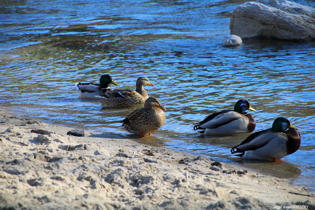 Sans mentir ces instants de vie de nos colverts ardéchois me furent racontés par un vieux mâle déplumé, en cet après-midi du 7 février dernier, sur la plage d'un beau village sacrément béni des dieux de la nature. Il s'agit de Vogüé situé assez loin de sa capitale Aubenas pour ne pas lui faire de l'ombre quand le Mistral, vent qui vient du nord, chasse les quelques nuages perdus dans nos contrées. Et ces canards m'ont avoué qu'ils nous aiment bien nous les humains et nos sacs de victuailles toujours à portée d'une main volontiers partageuse. Alors ils ne s'éloignent pas quand on approche de leur domaine hivernal, l'eau sacrée de la rivière Ardèche. Bien au contraire ils accourent, ils nagent vite les bougres. Un moment de savante alchimie offert durant ces temps de communication entre hommes et animaux. Ils sont beaux ces jours !